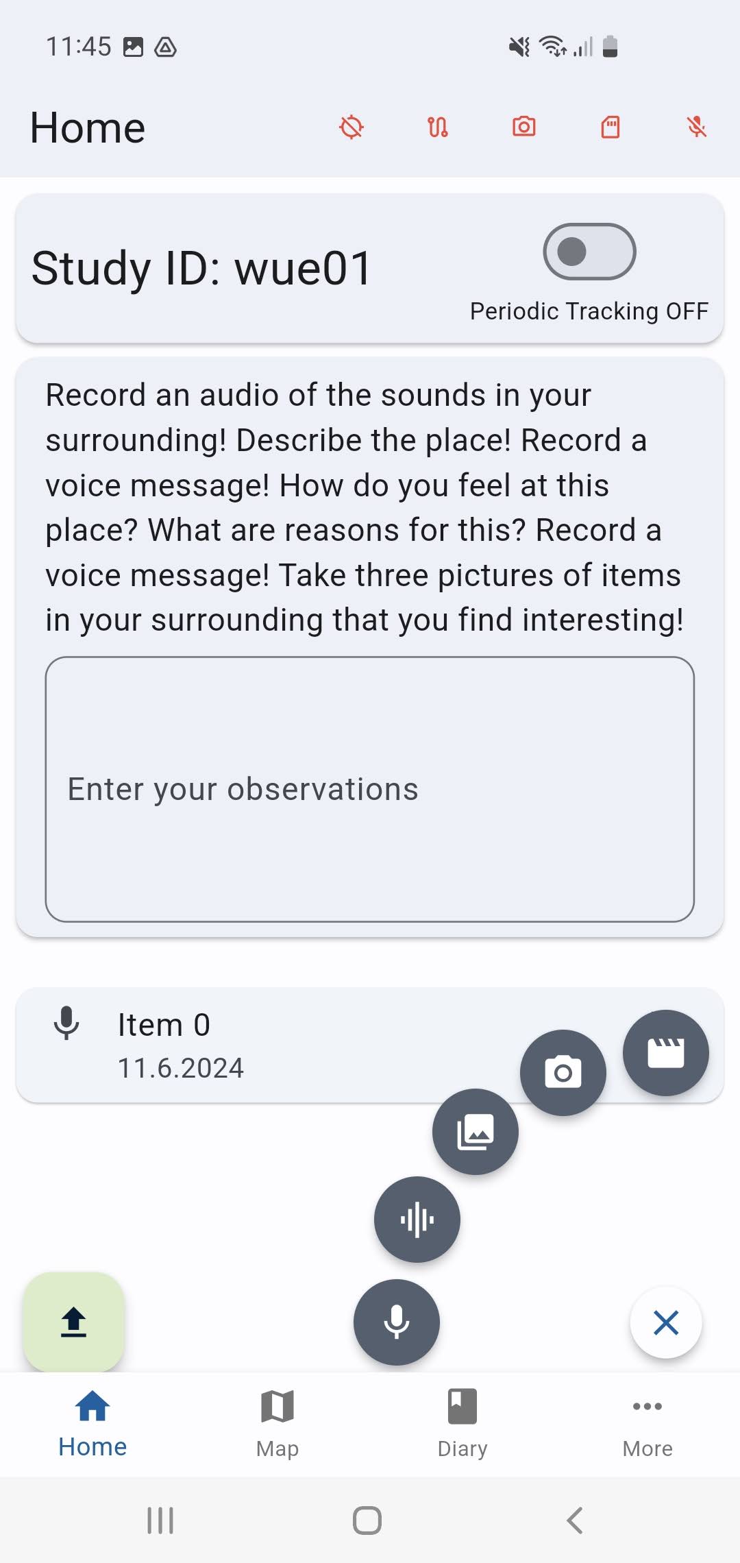 - After logging in to the respective study, users can record their observations via the intuitive user interface and upload text descriptions, audio, image and video files.